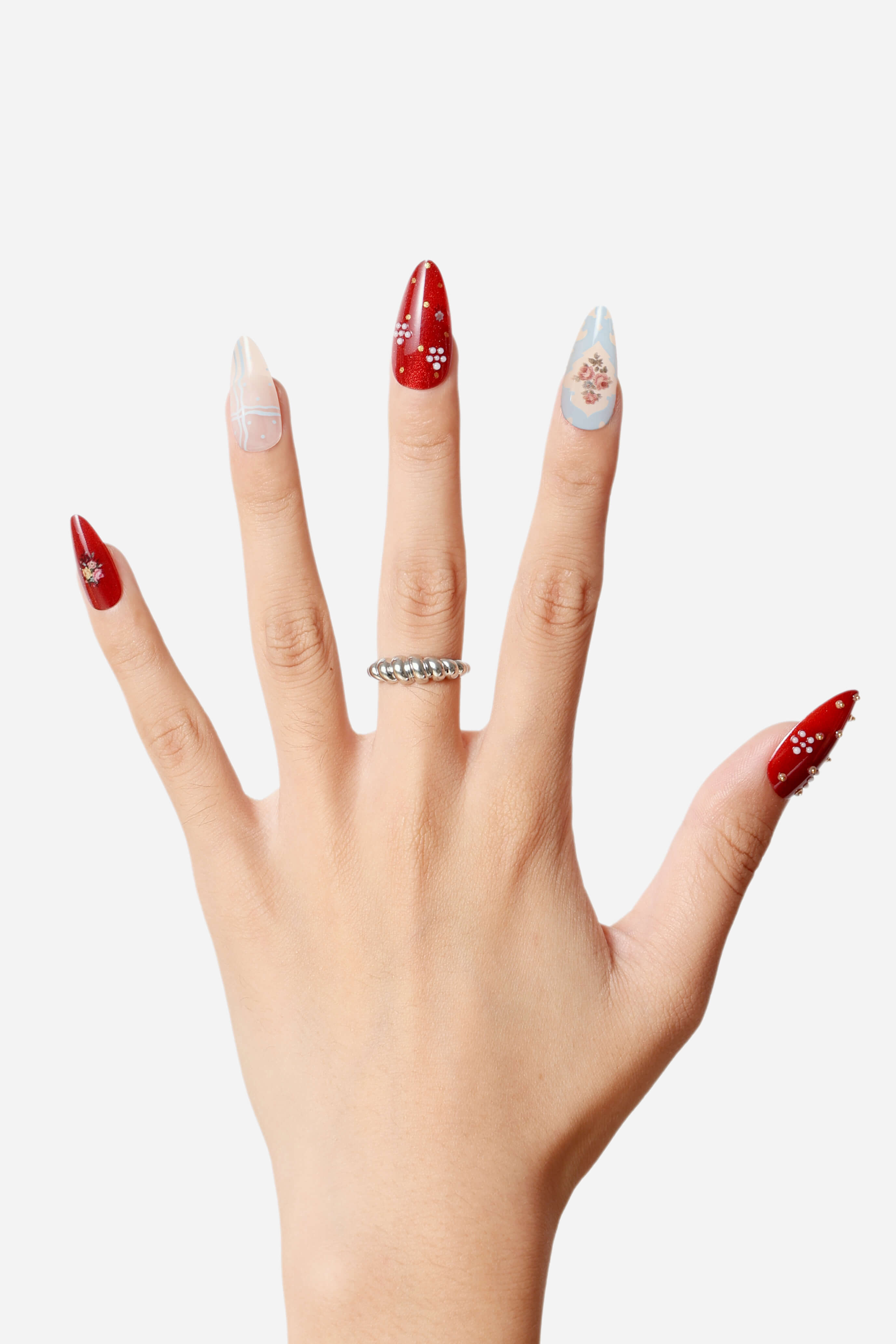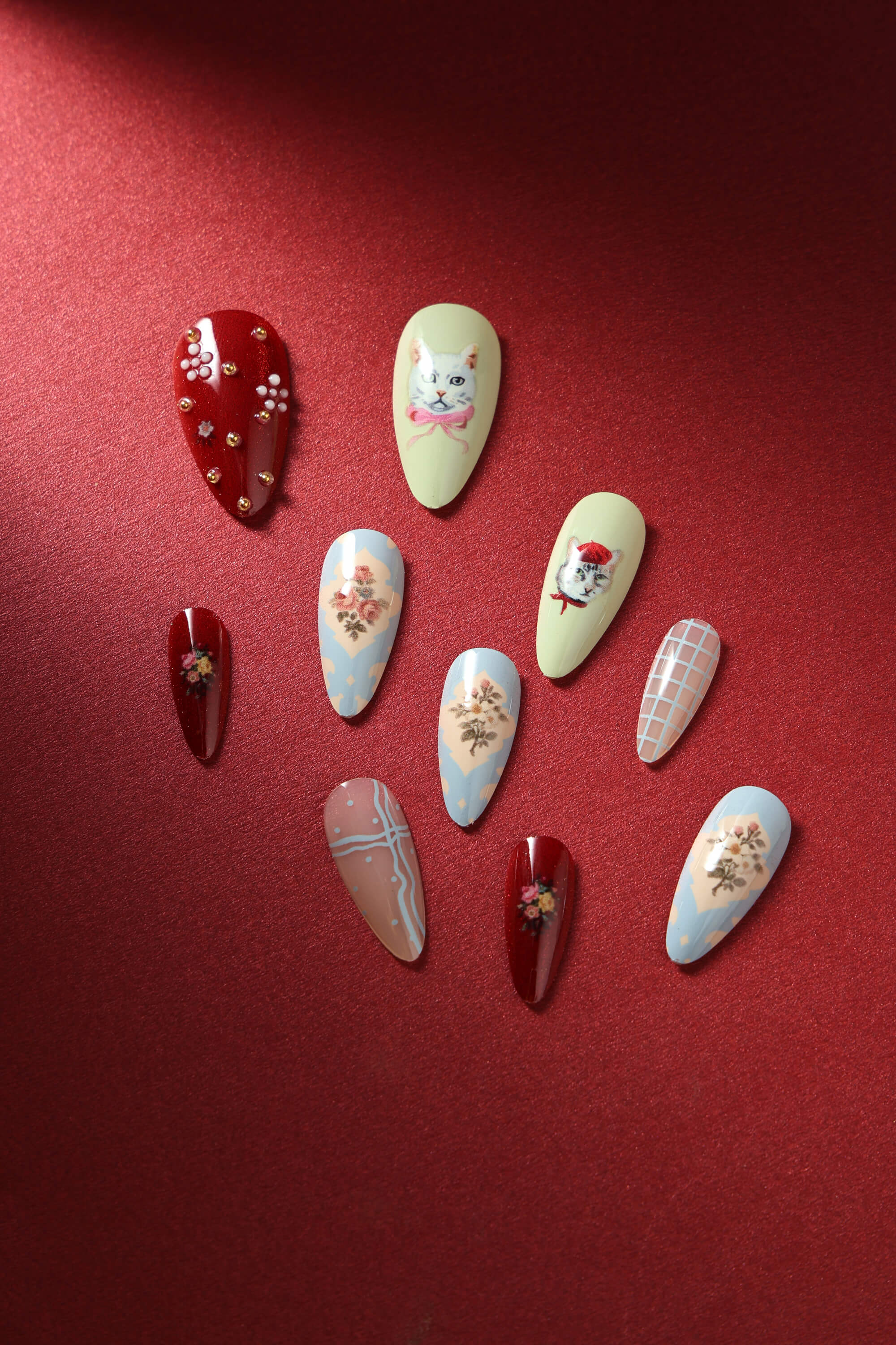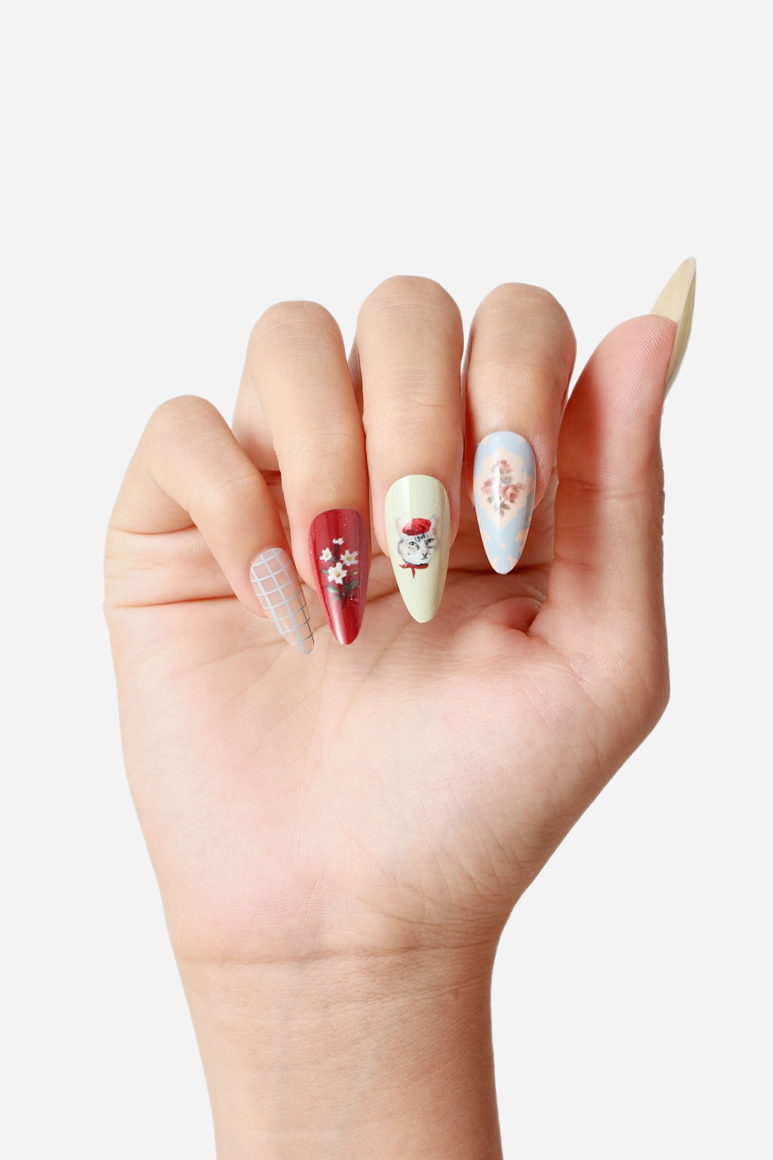A charming set of reusable press-on nails feature playful designs.