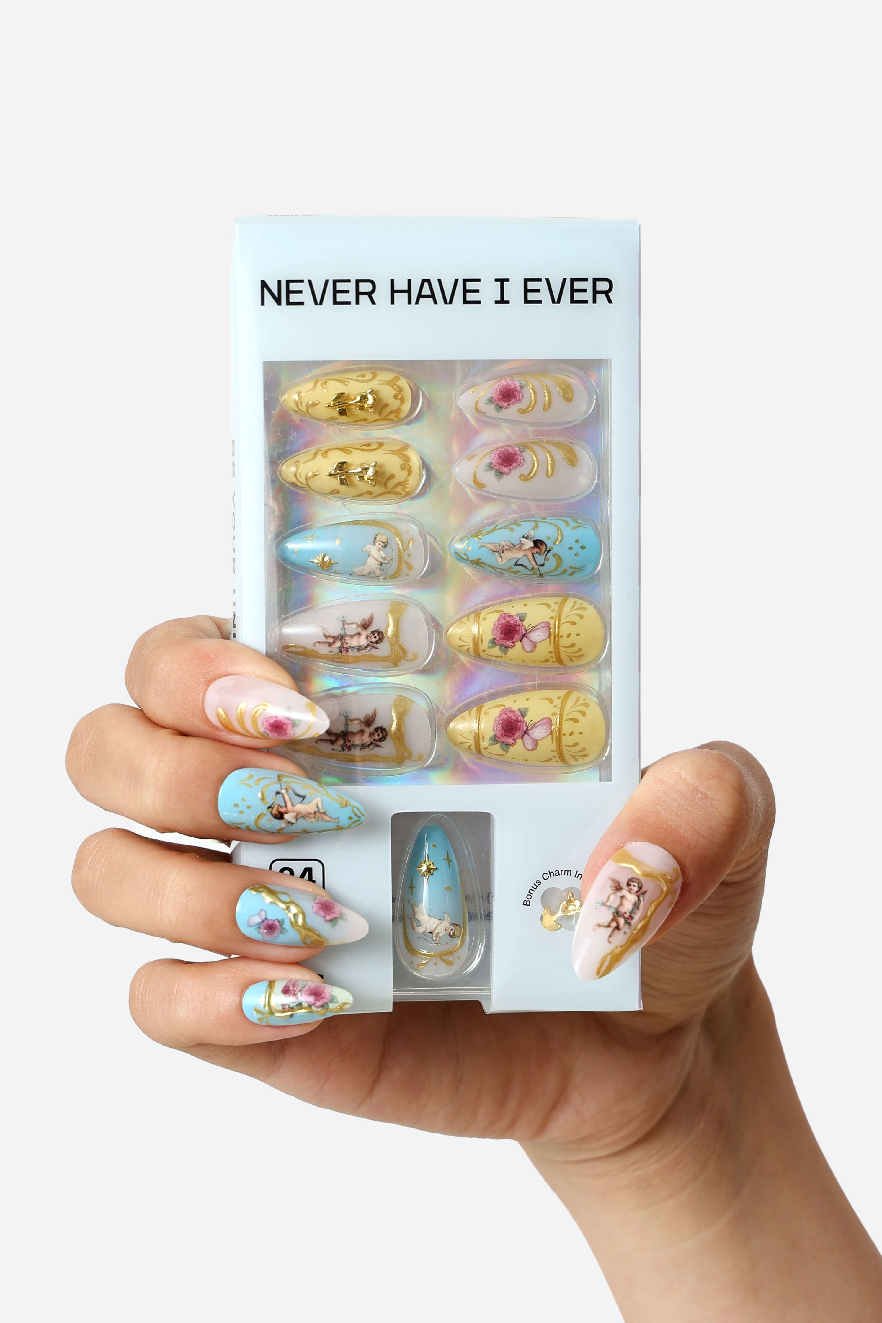 A charming set of reusable press-on nails feature playful designs.