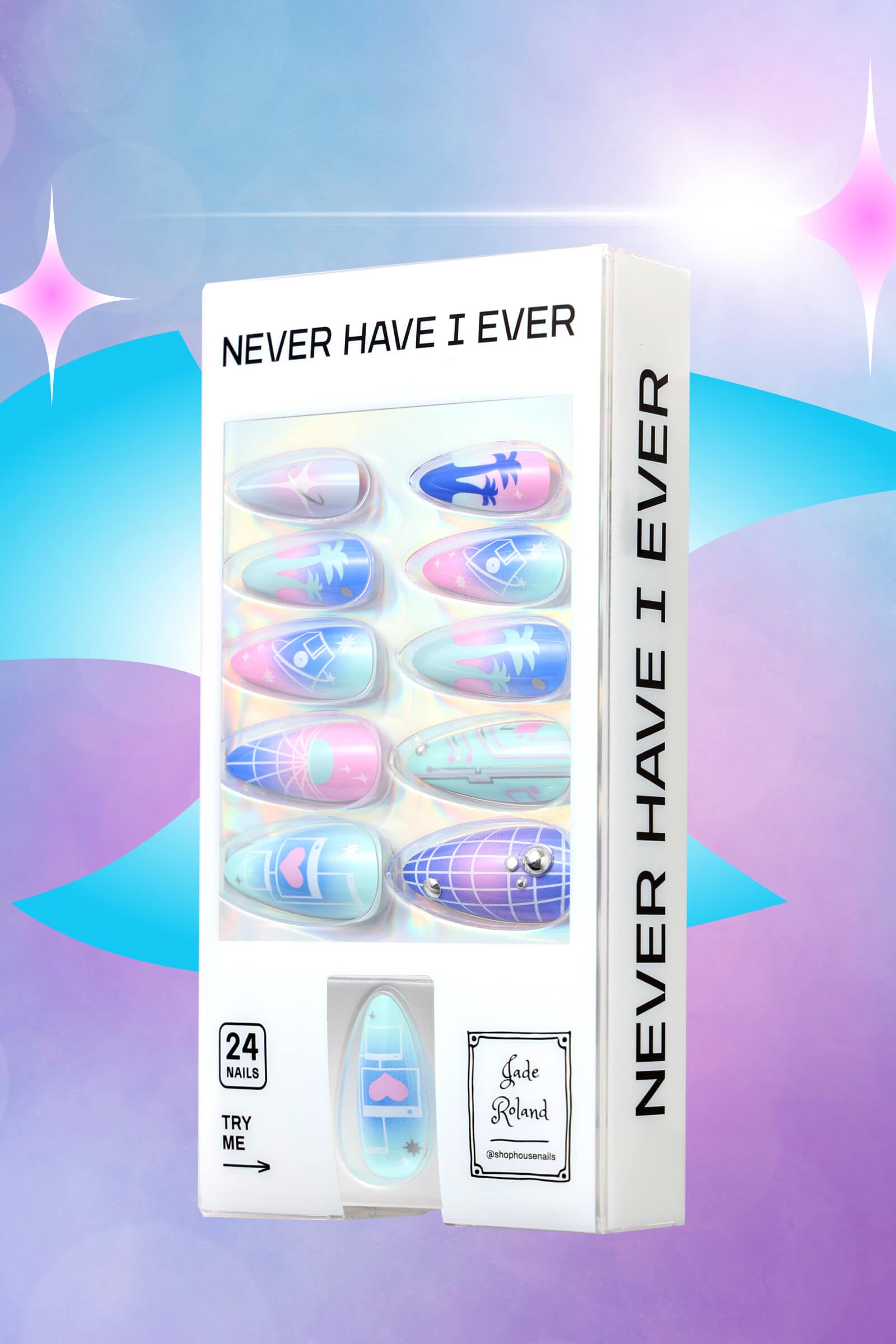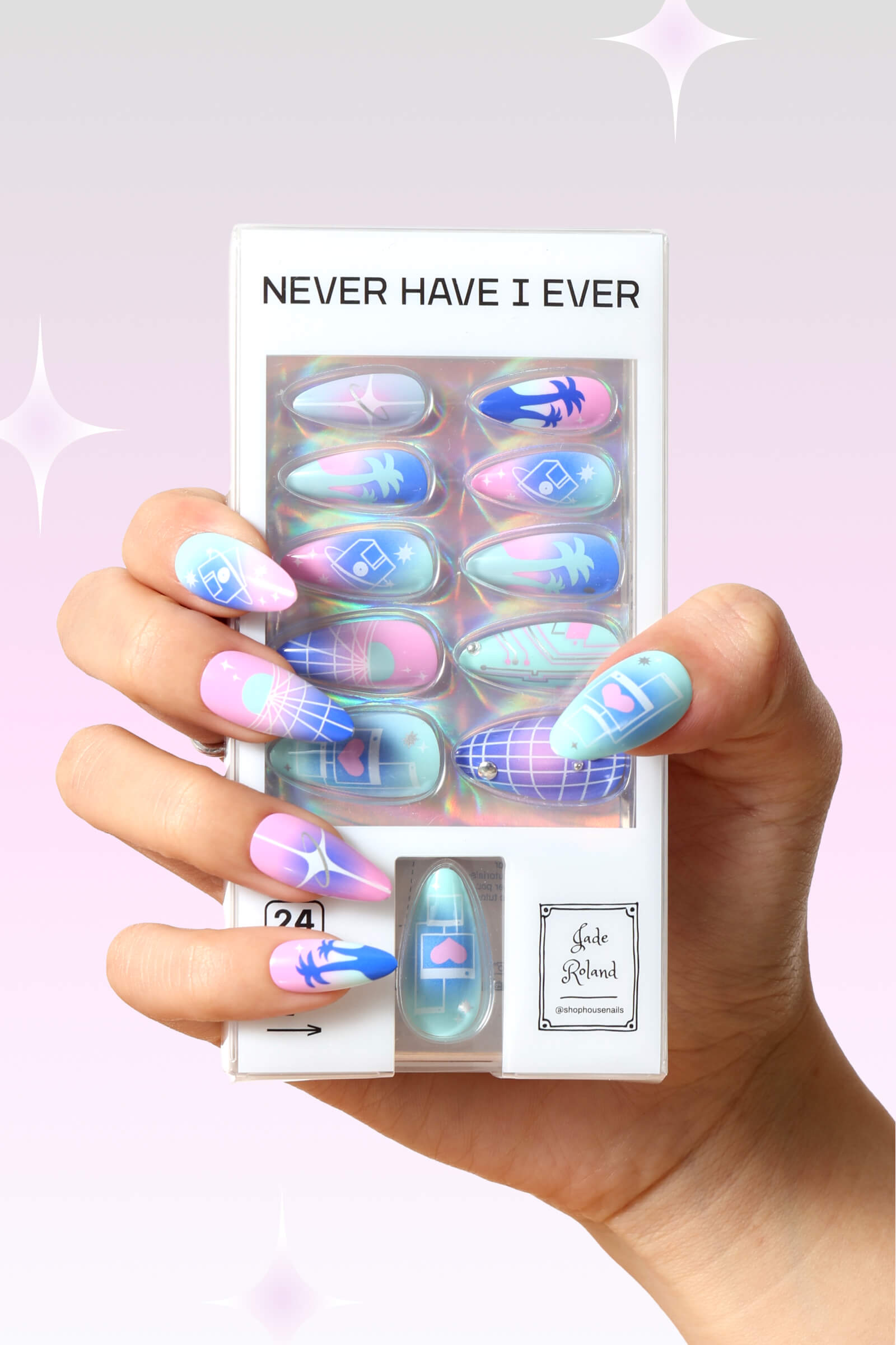 • Quality press-on nails feature unique designs created by Jade Roland