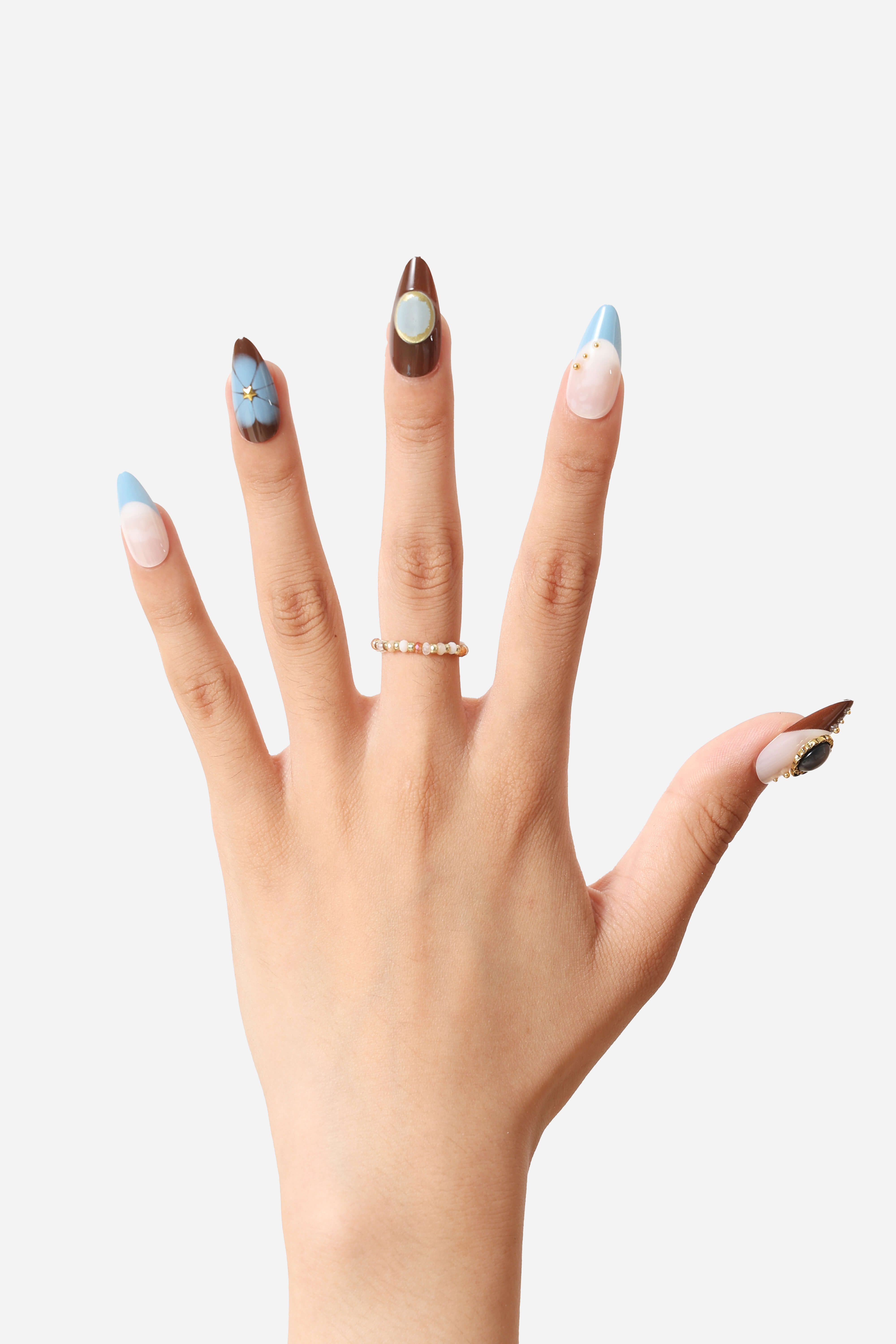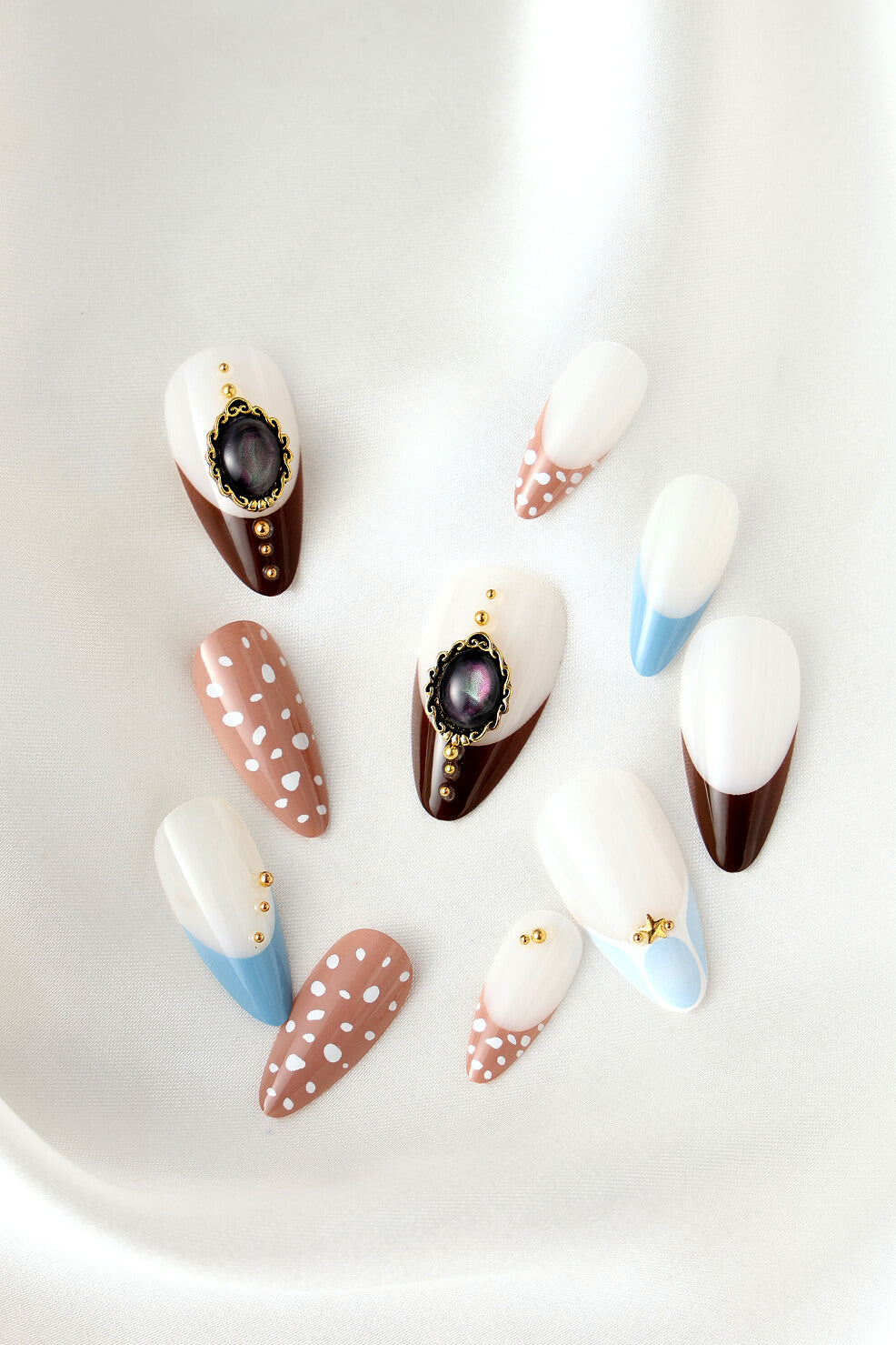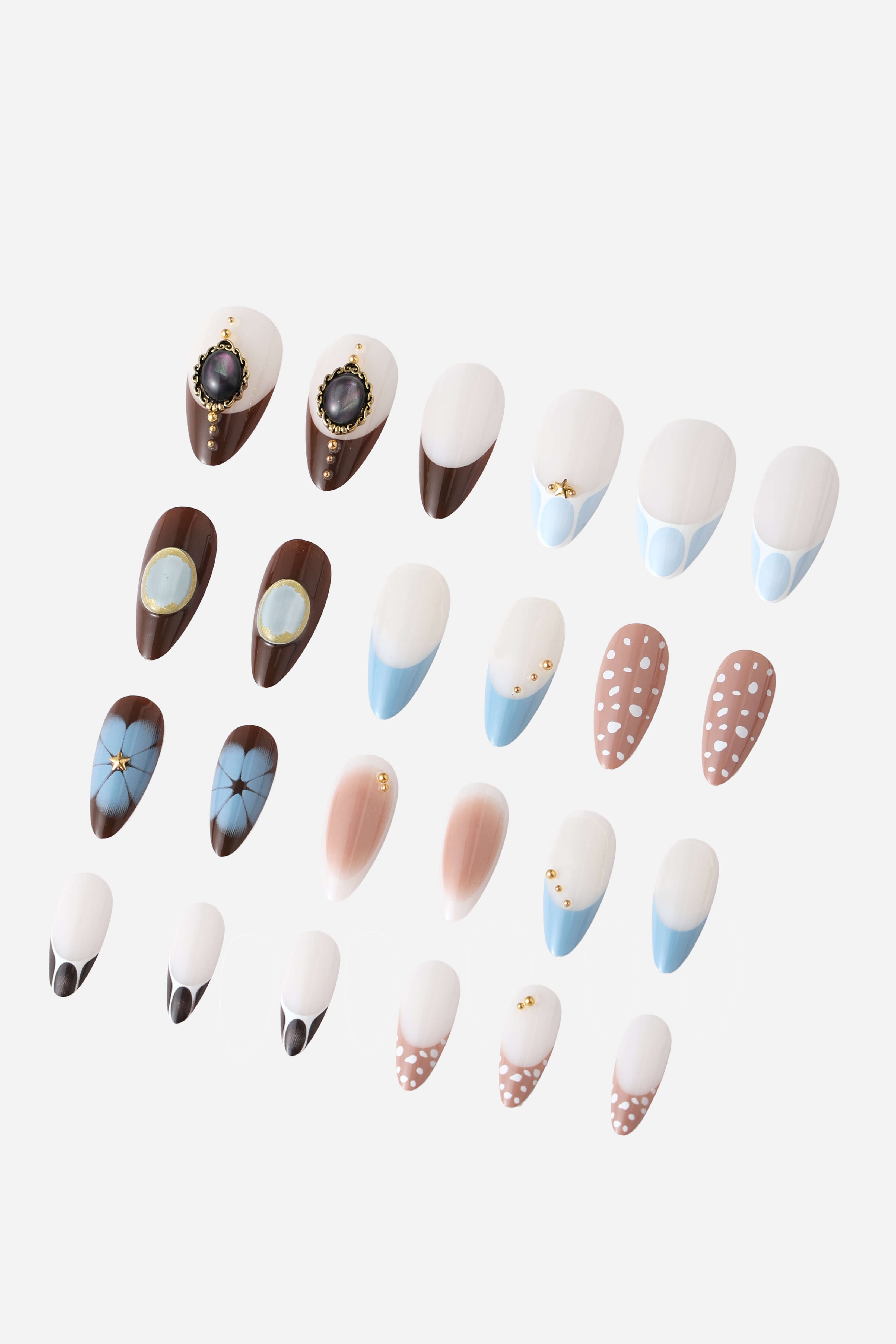 A charming set of reusable press-on nails feature playful designs.