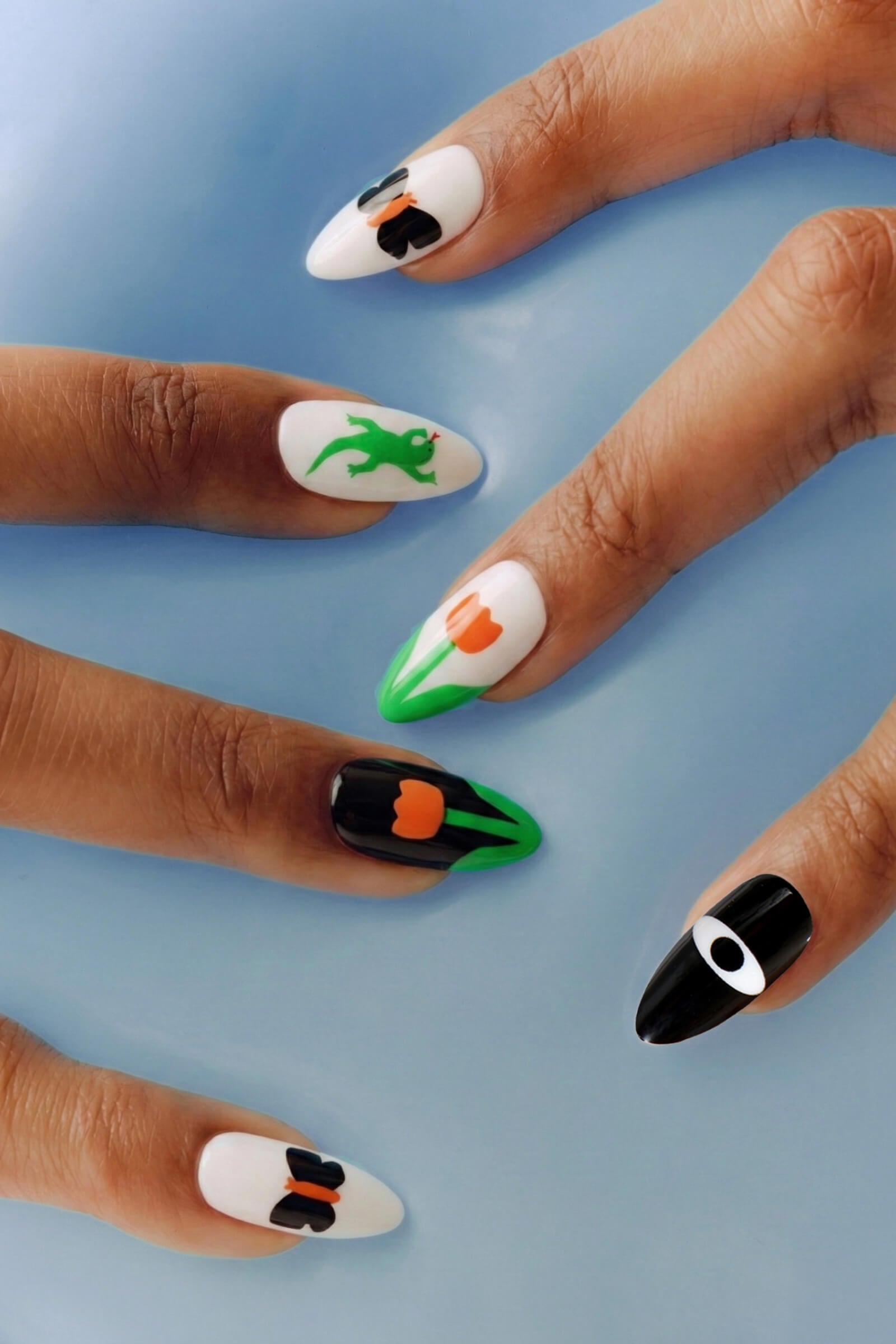 A charming set of reusable press-on nails feature playful designs.