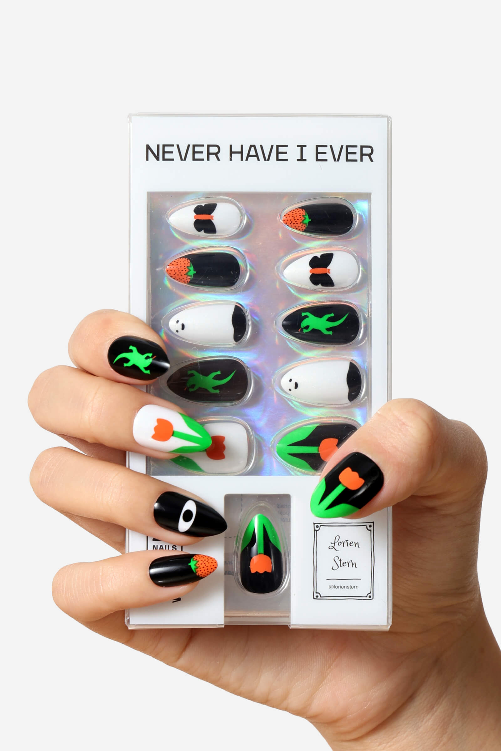• Quality press-on nails feature unique designs created by Lorien Stern