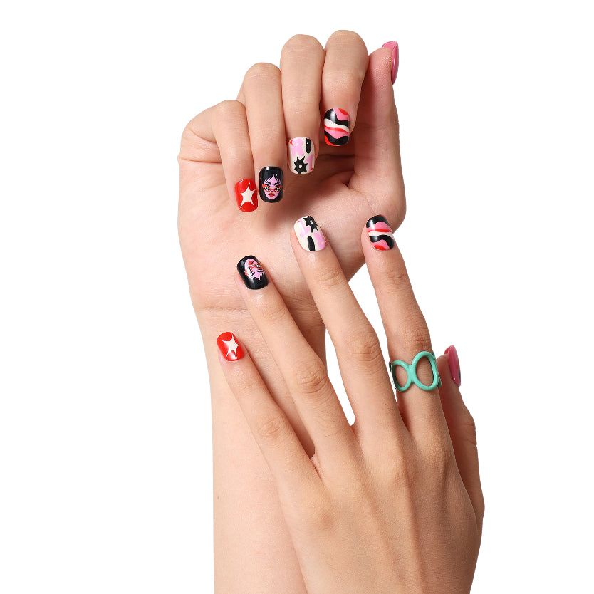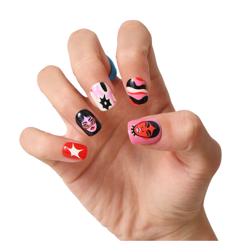 A cool and unique set of reusable press-on nails feature playful designs!