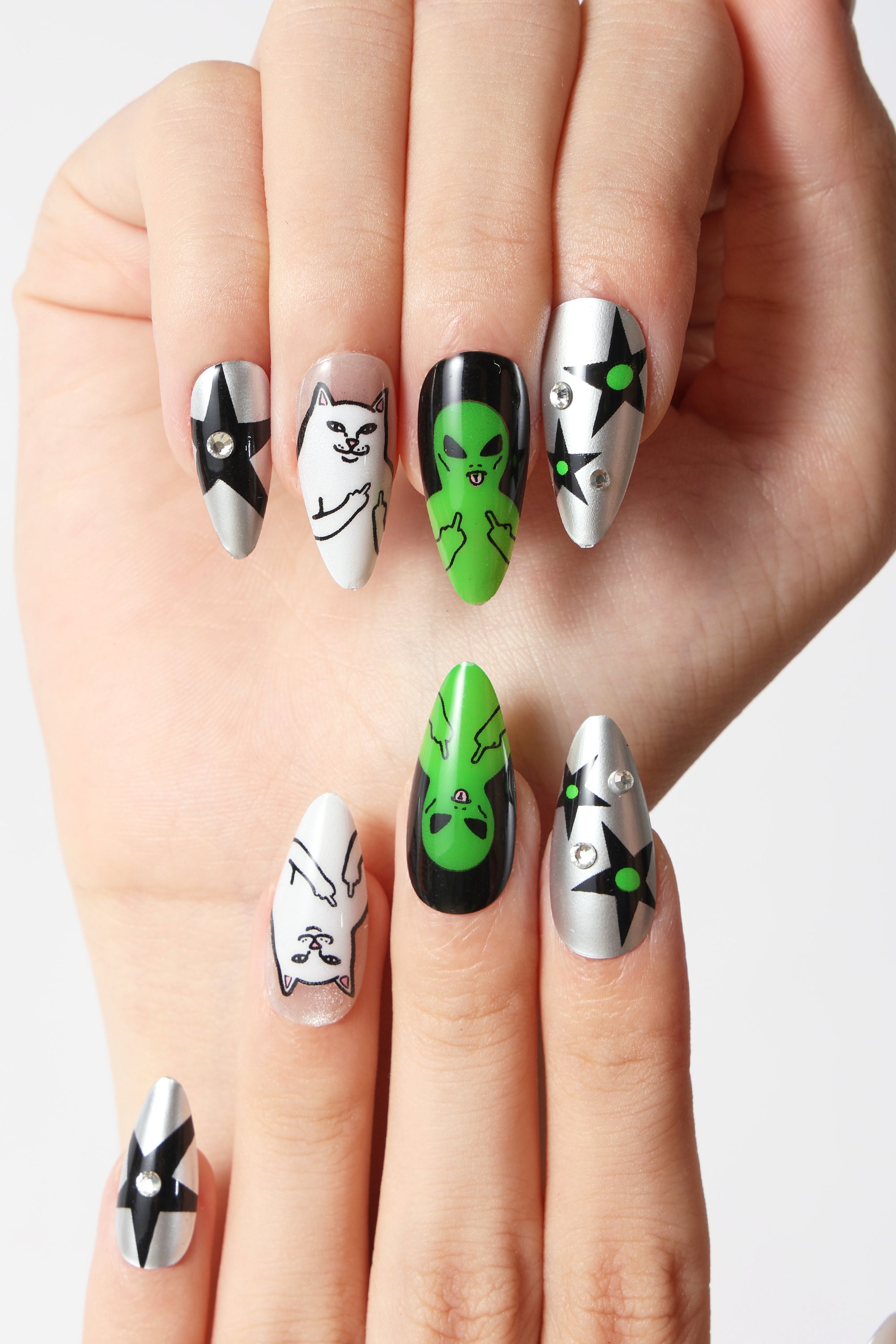 A charming set of reusable press-on nails feature playful designs.