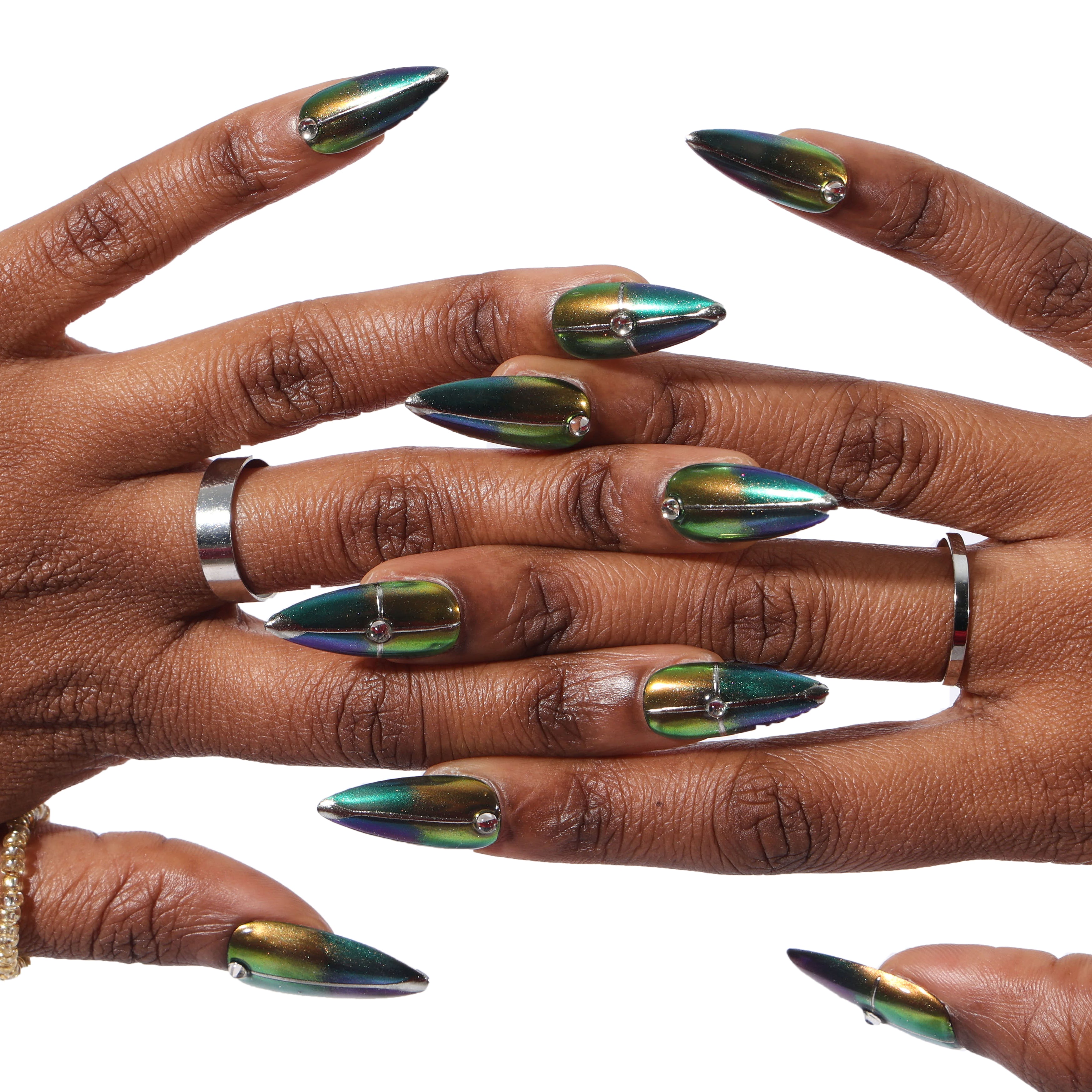 Never have I ever roamed eternal, but with these nails, you traverse in iridescent style. Echoing the chrome hues of scarab beetles and the classic Beetle car, this design blends timeless exploration with a shimmering spectrum of green and blue.