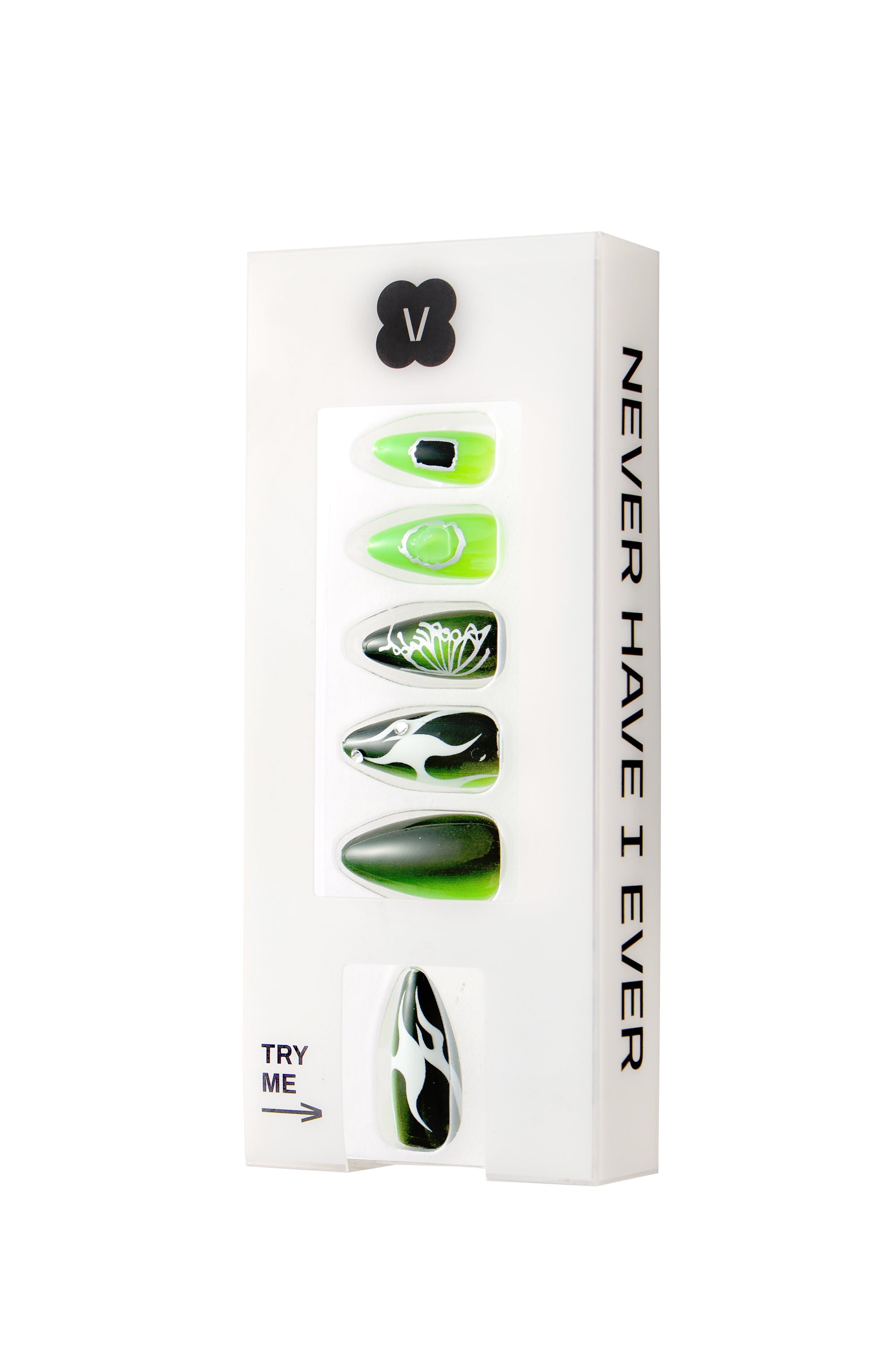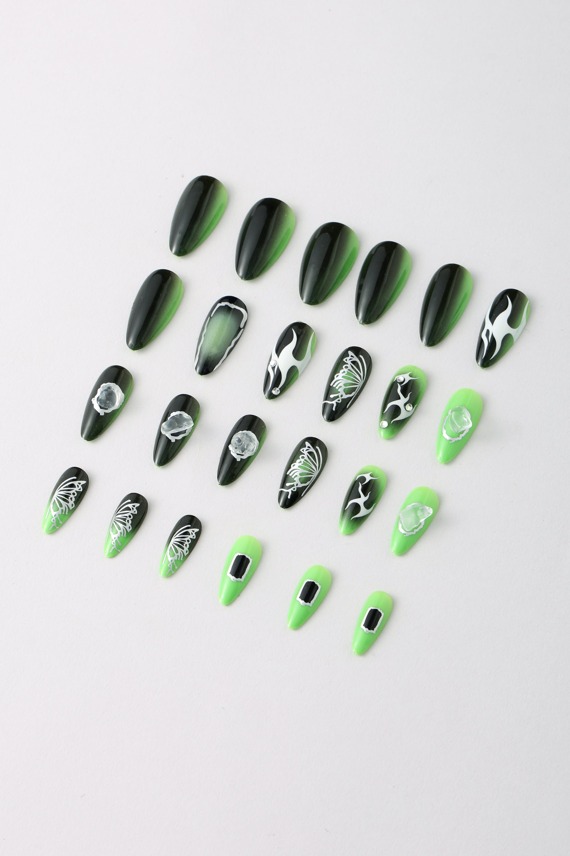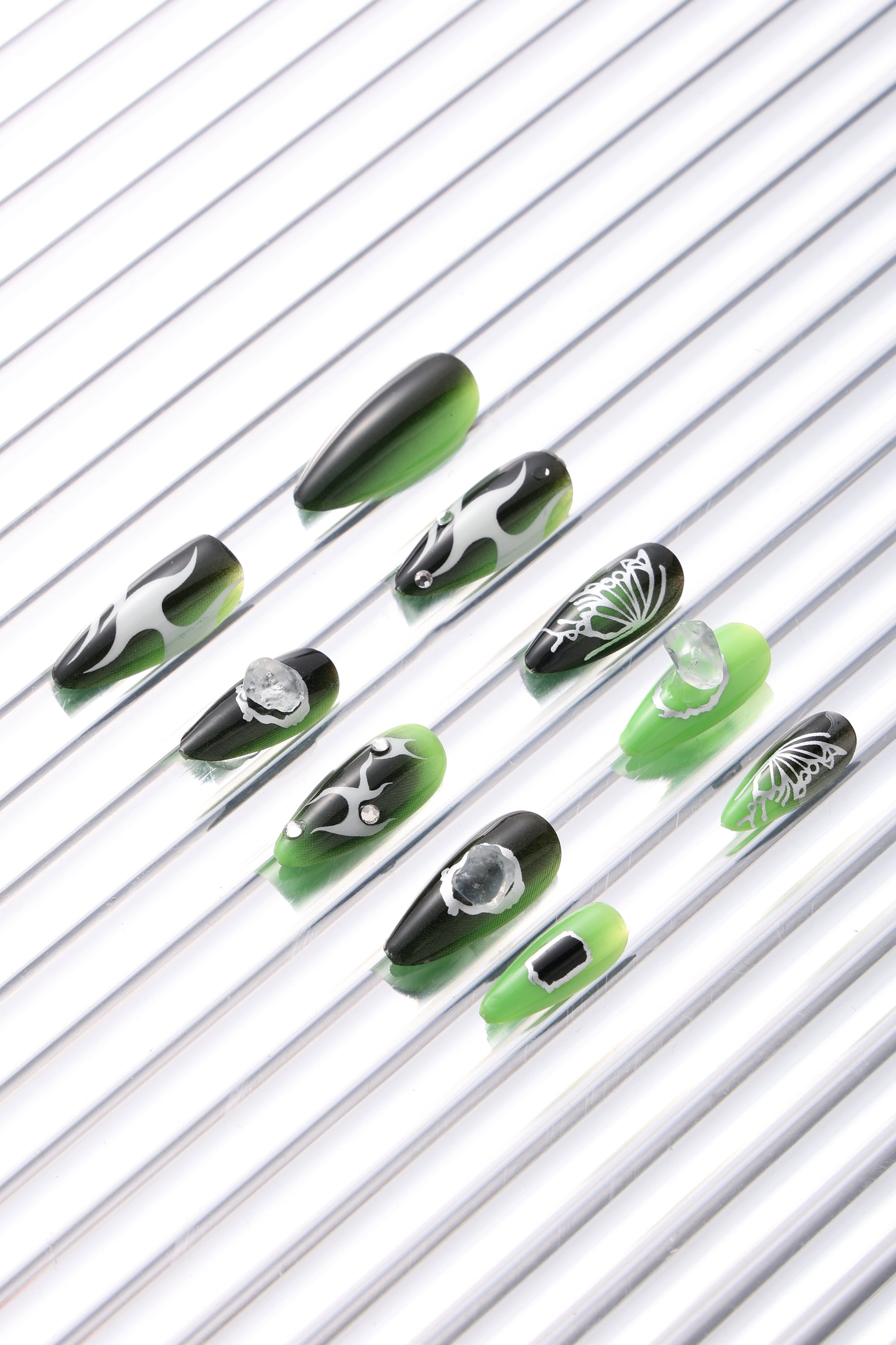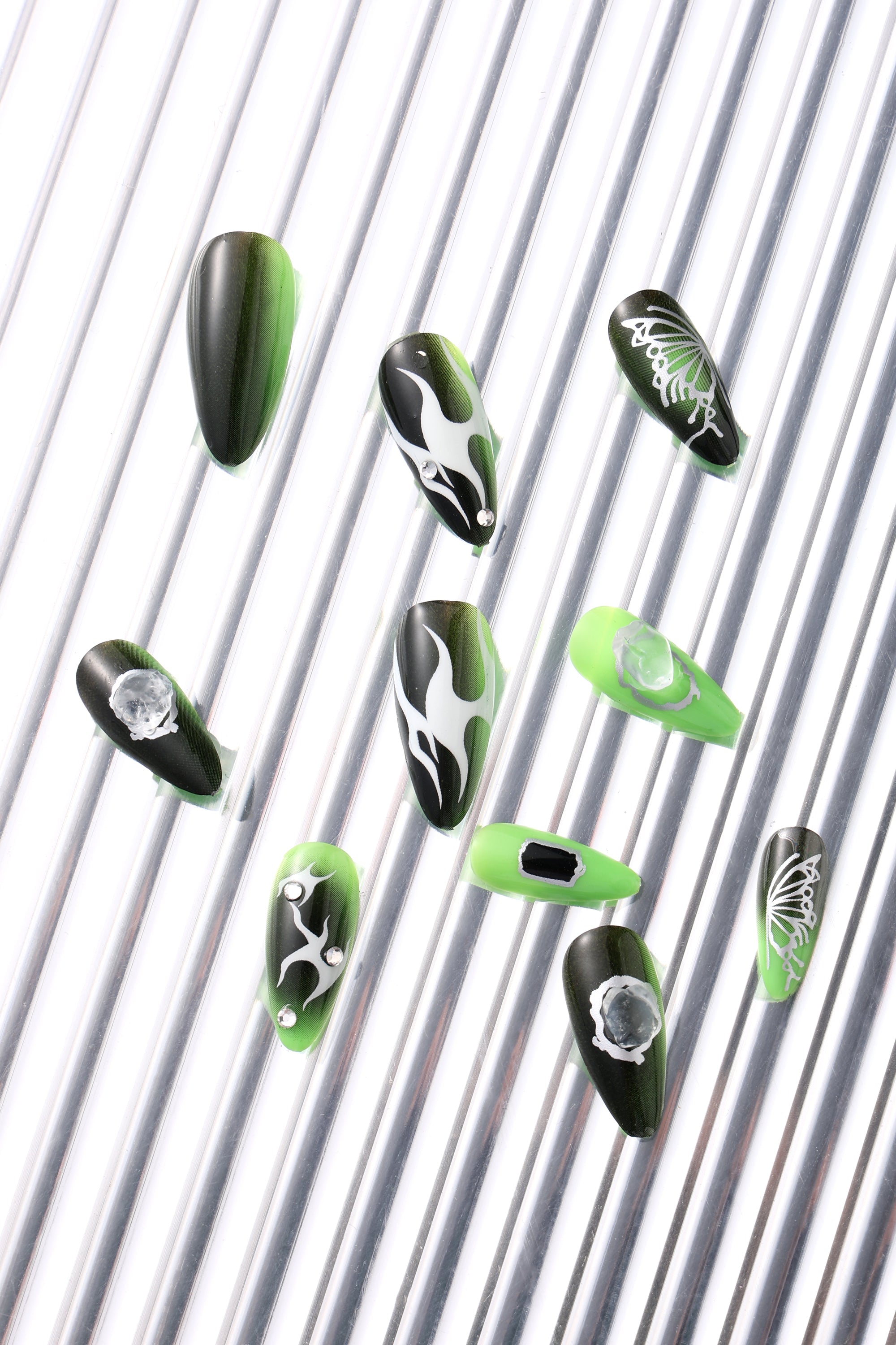 A charming set of reusable press-on nails feature playful designs.
