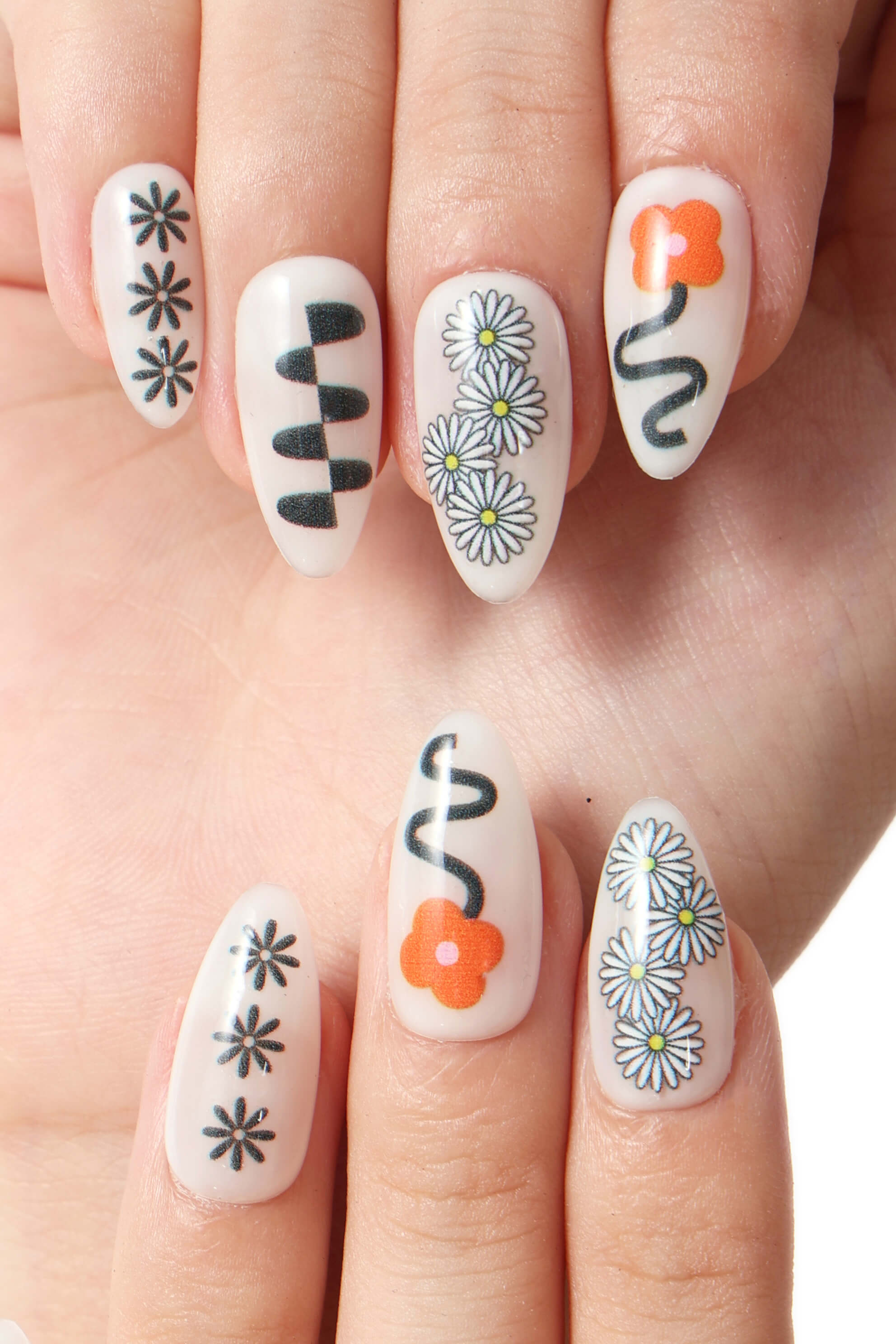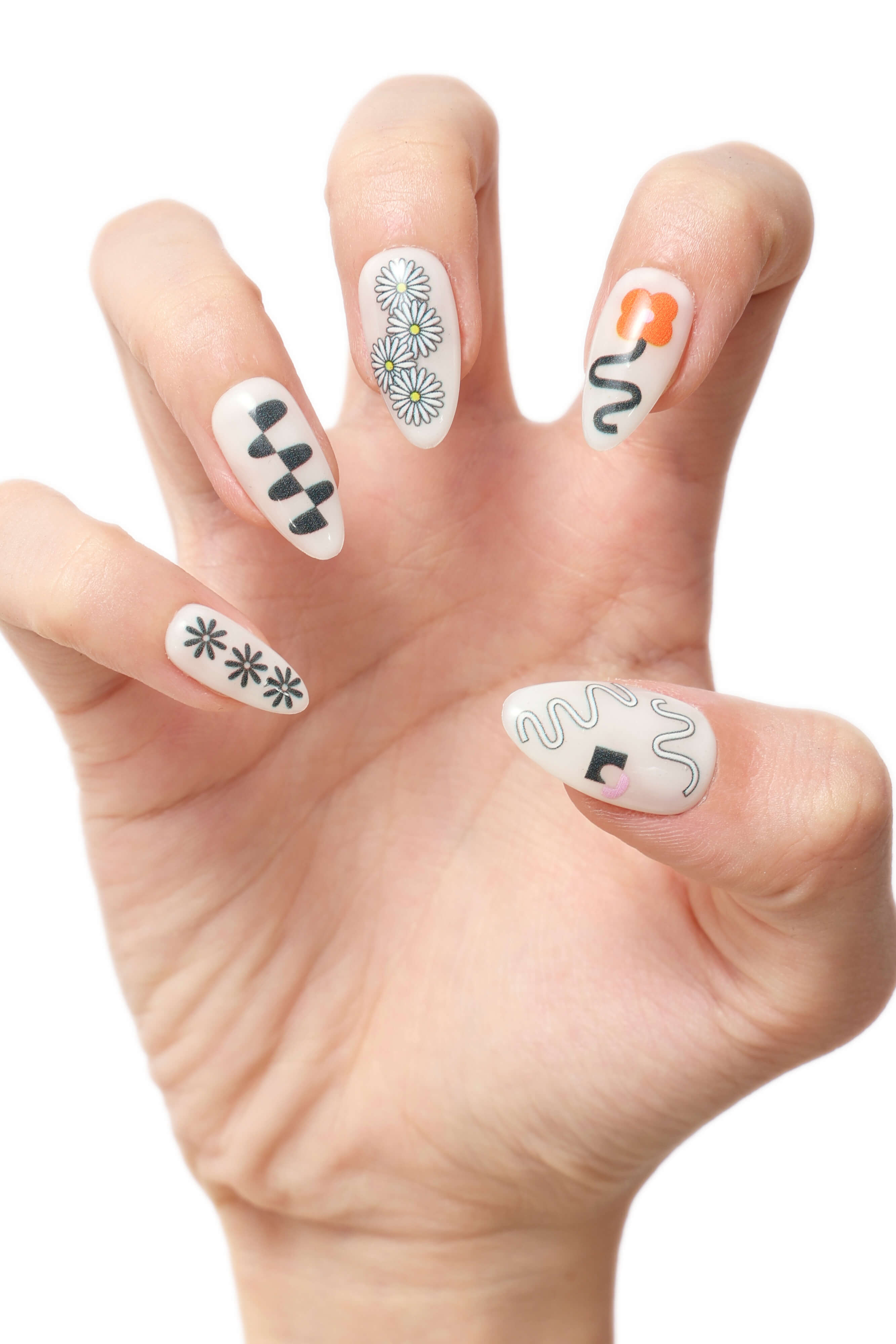 A cool and unique set of reusable press-on nails feature playful designs!
