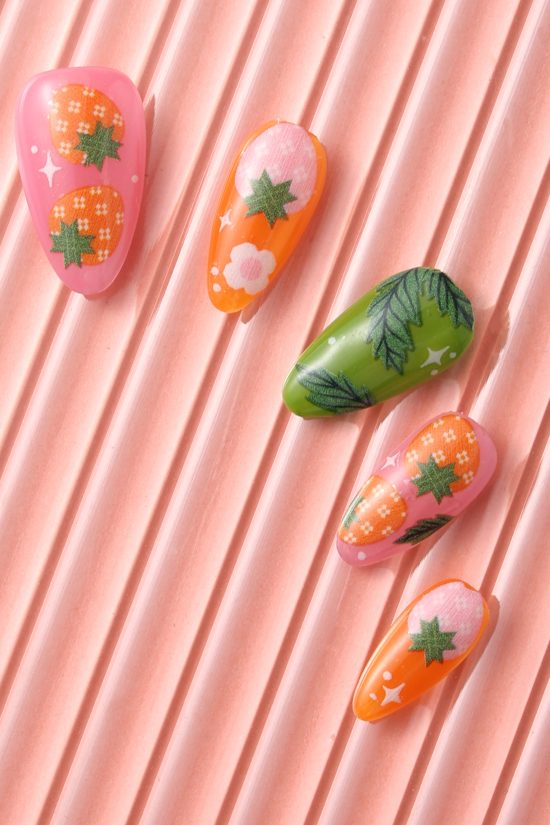 A cool and unique set of reusable press-on nails feature playful designs!
