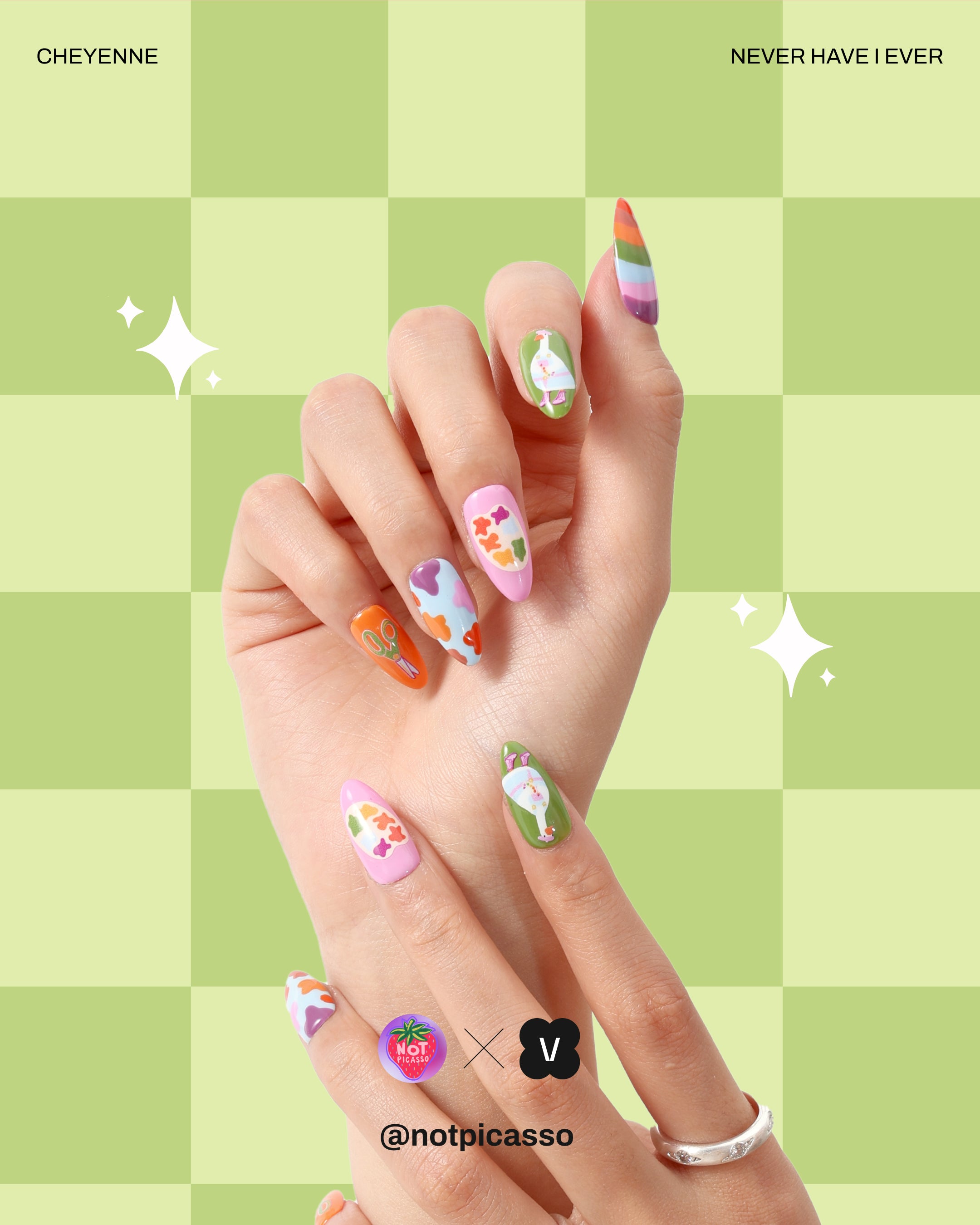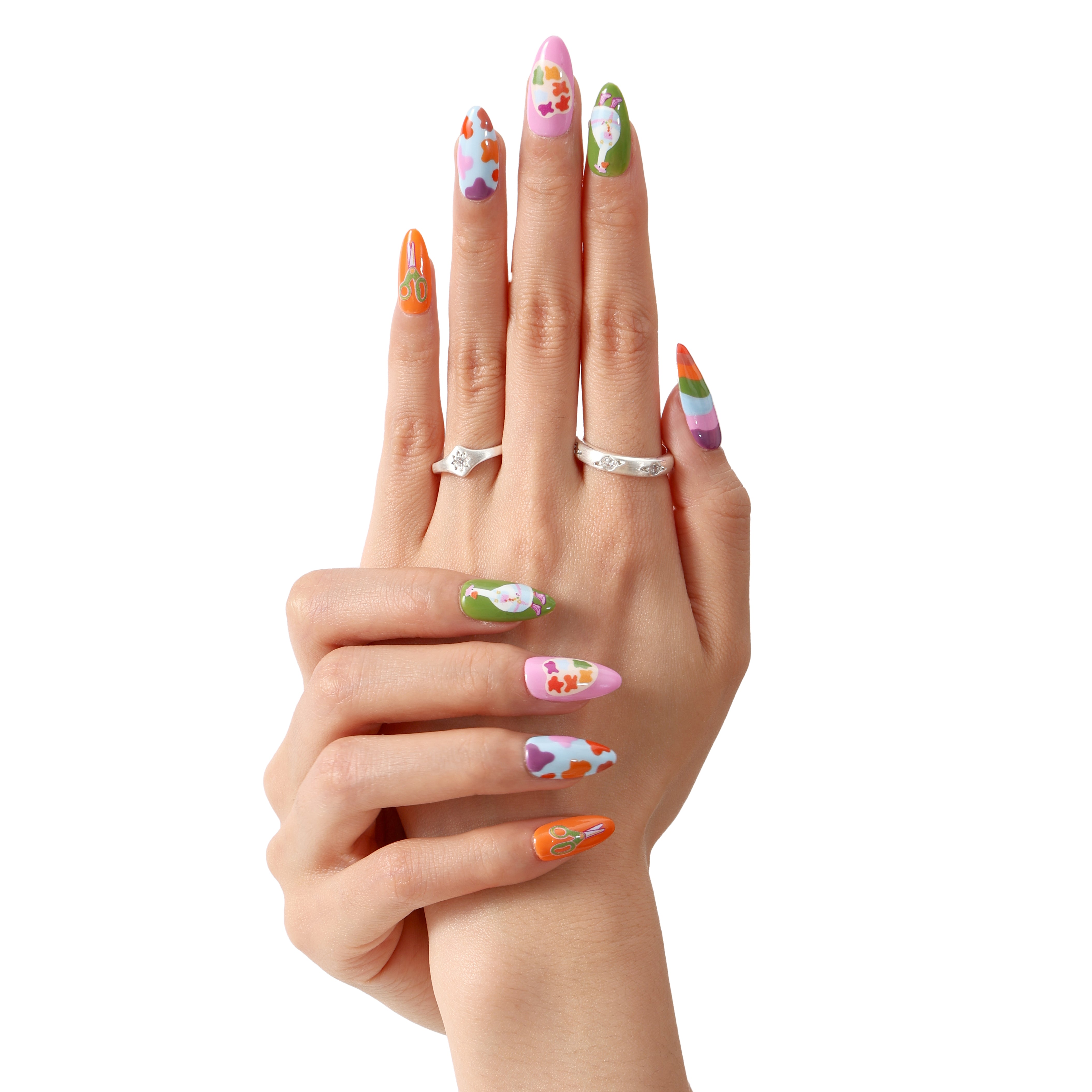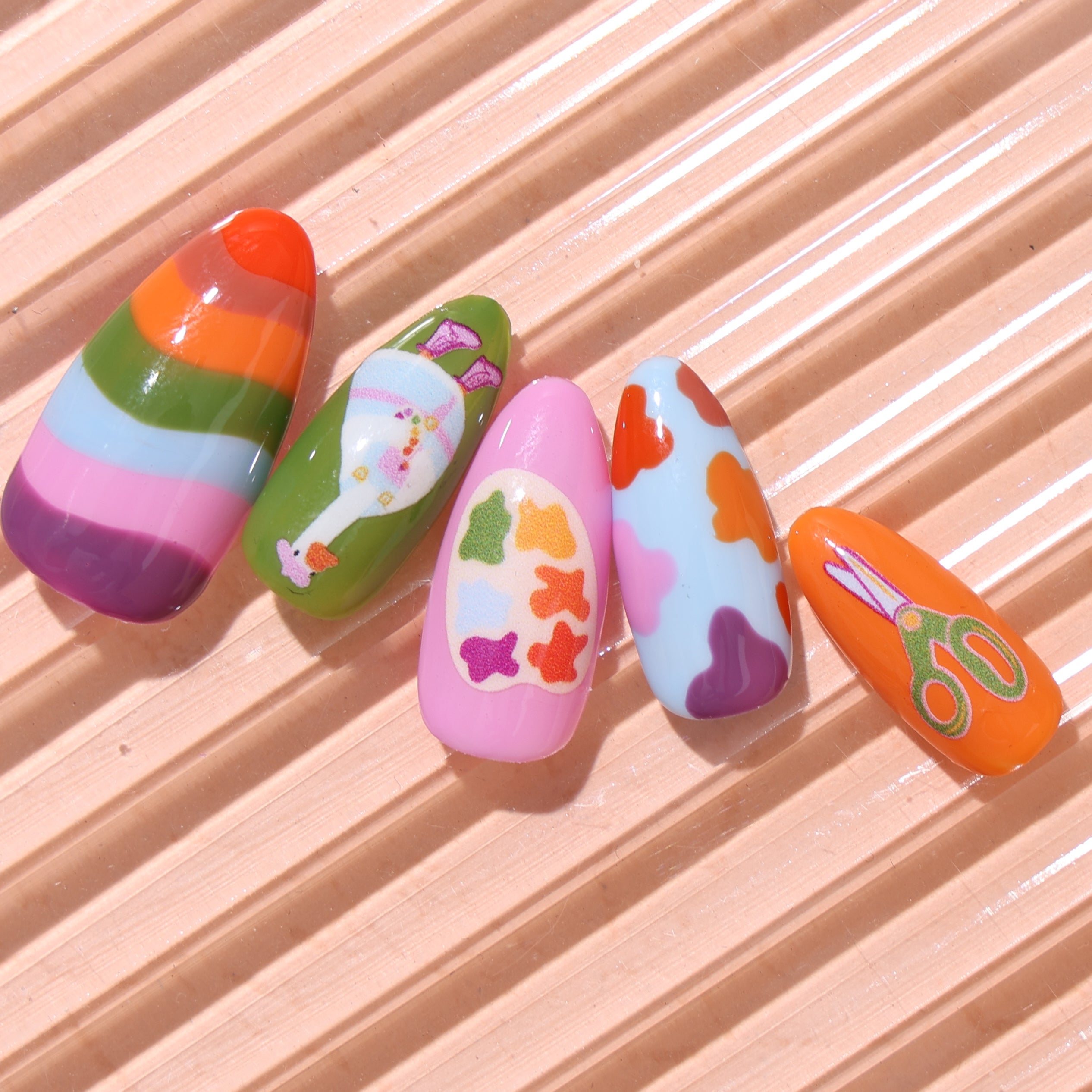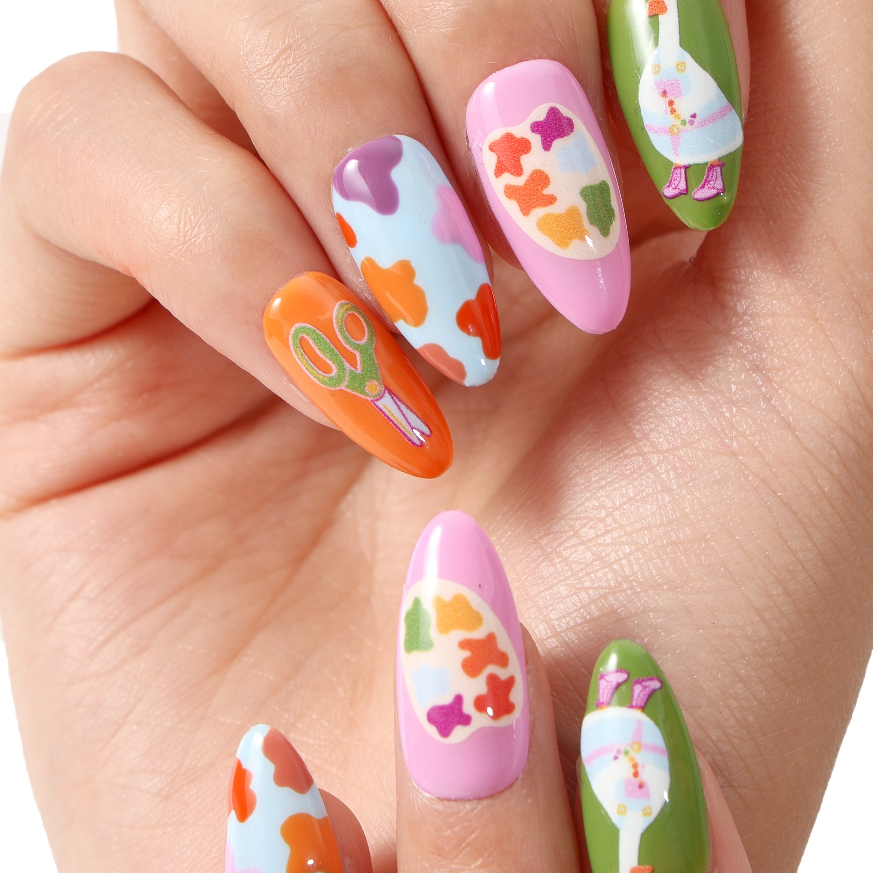 A charming set of reusable press-on nails feature playful designs.