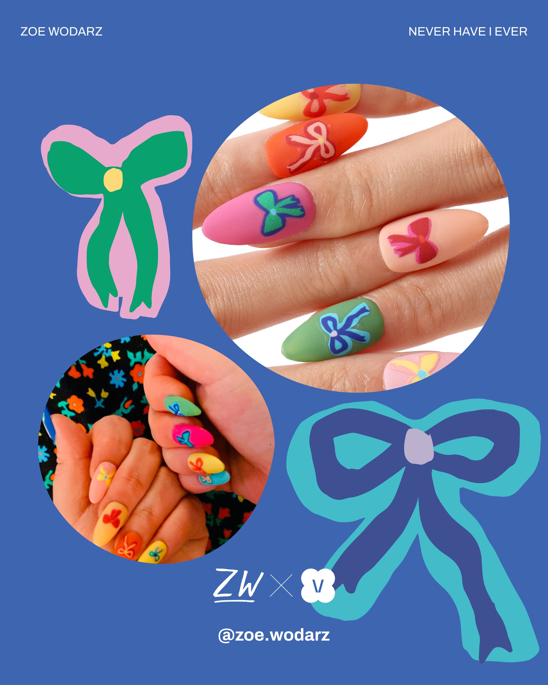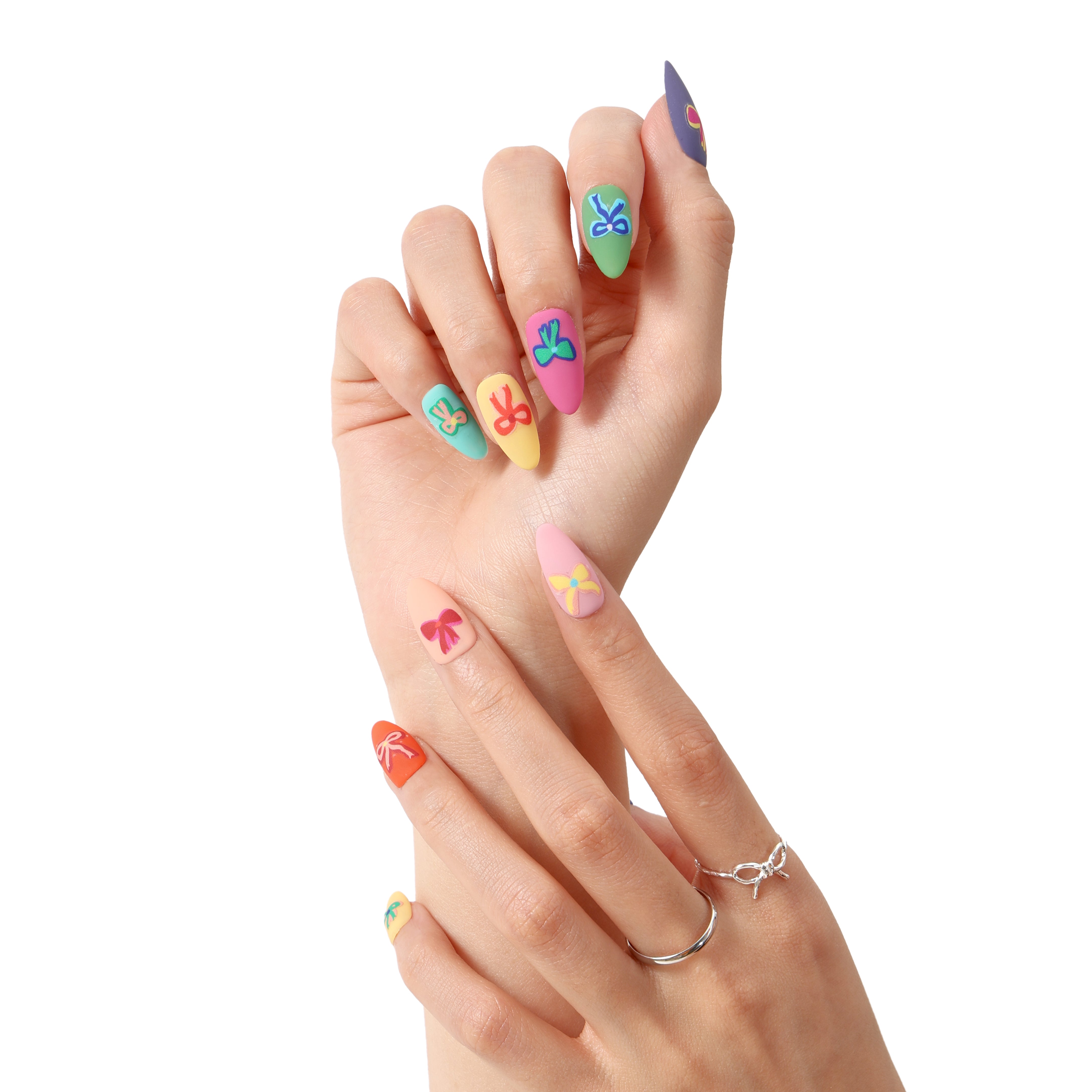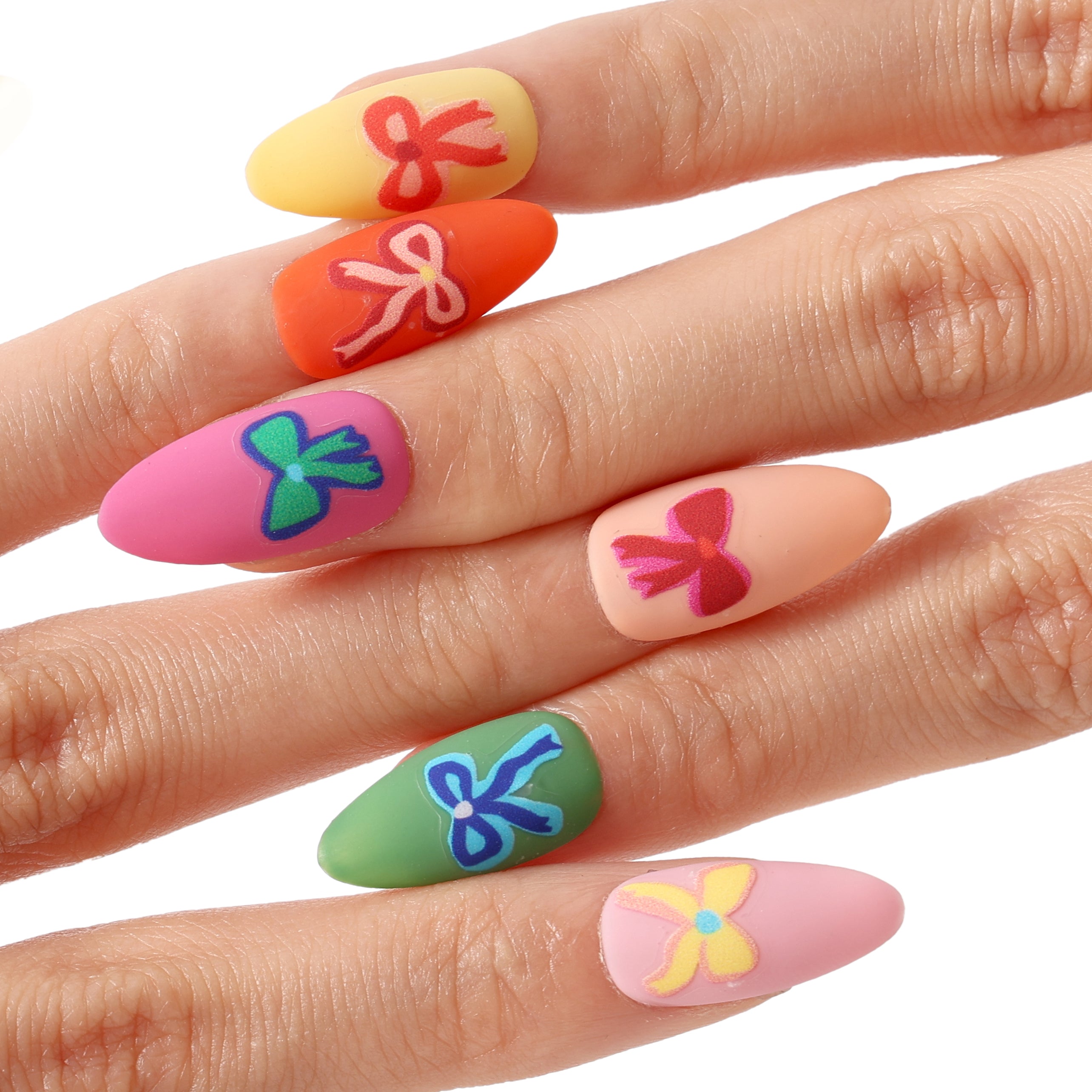 A charming set of reusable press-on nails feature playful designs.